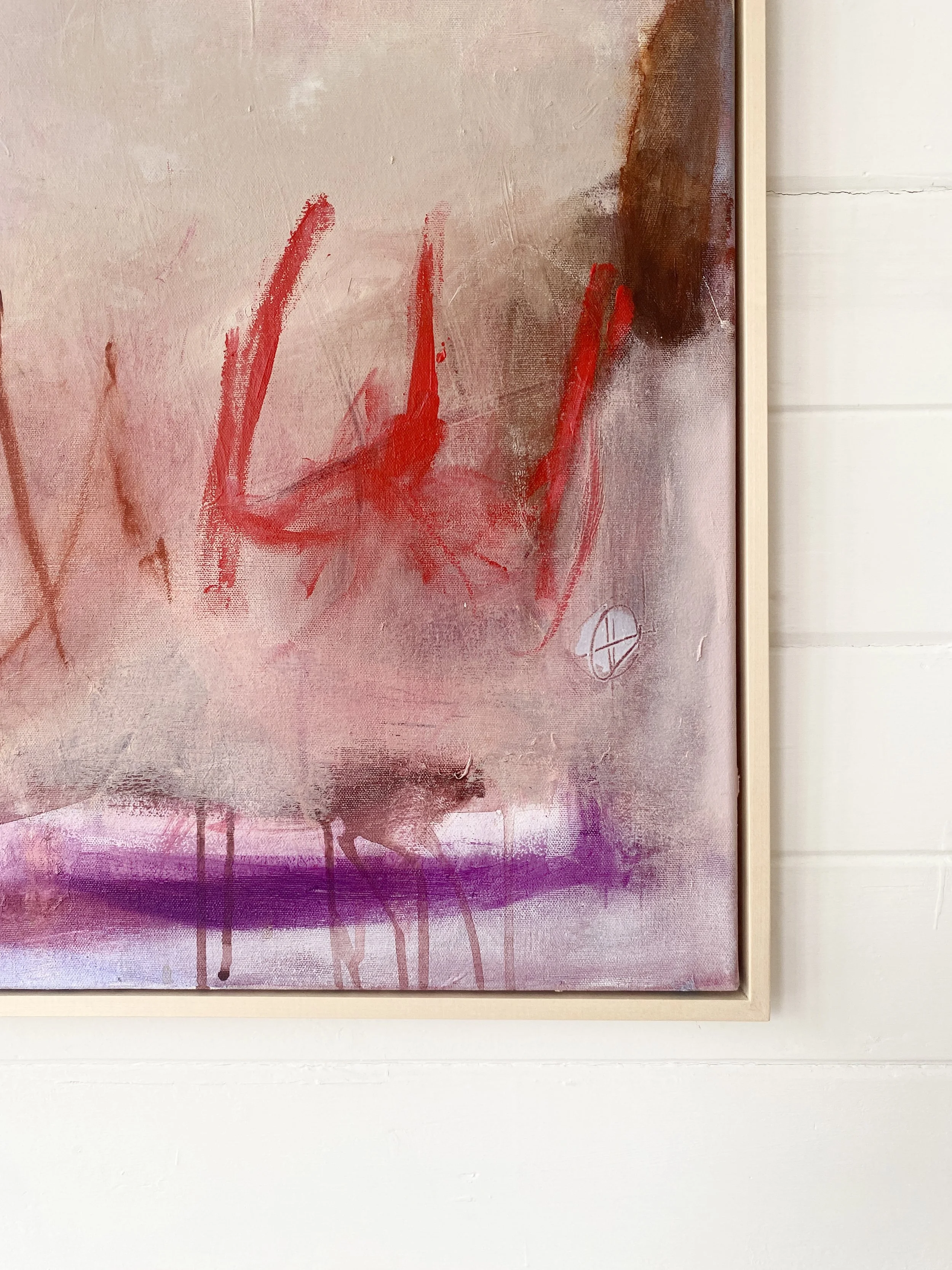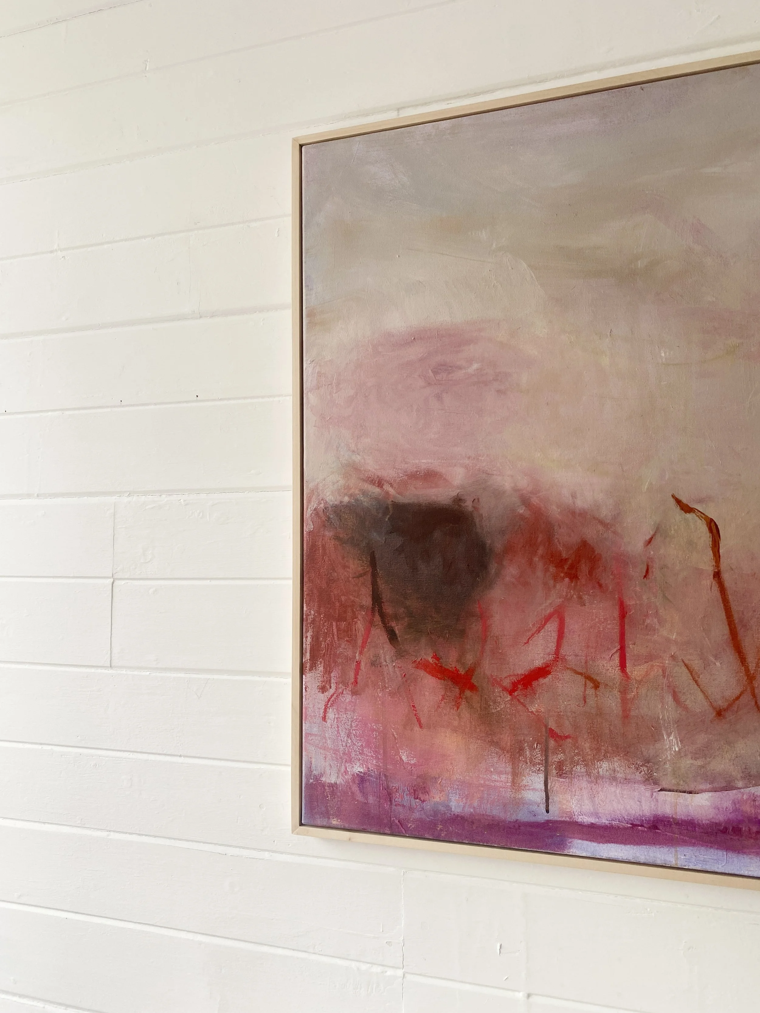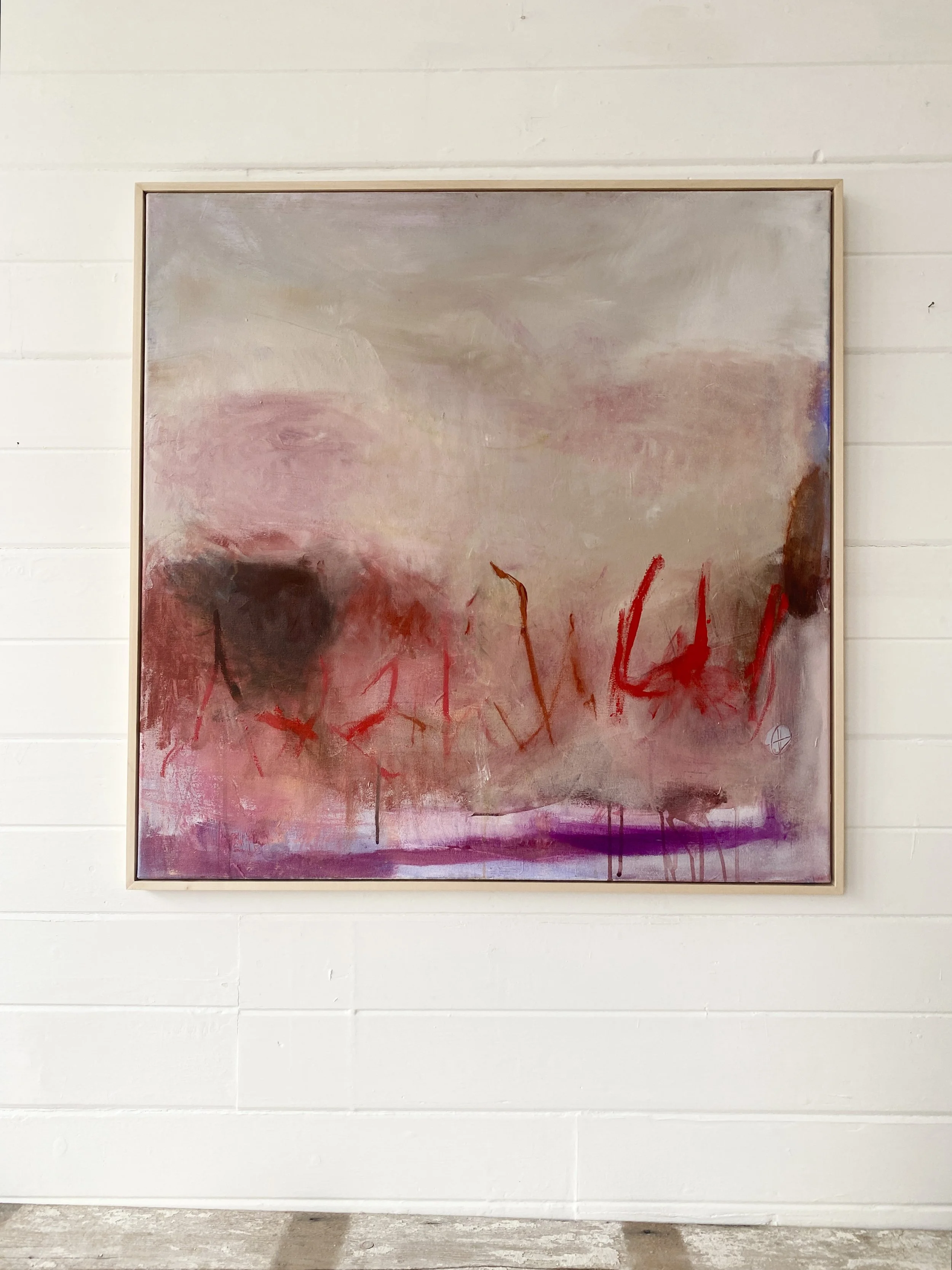 Oil and mixed media on canvas, framed in ash